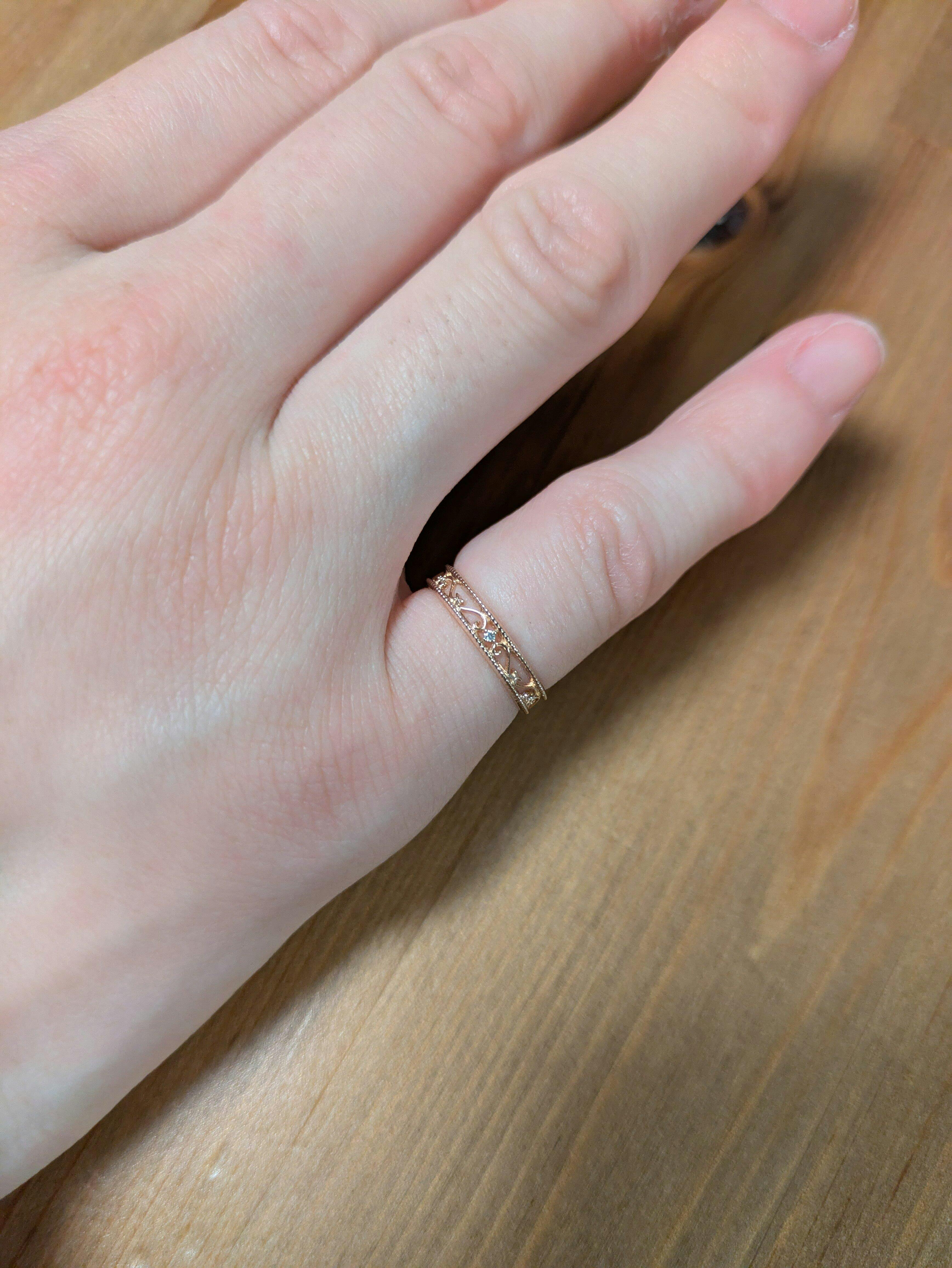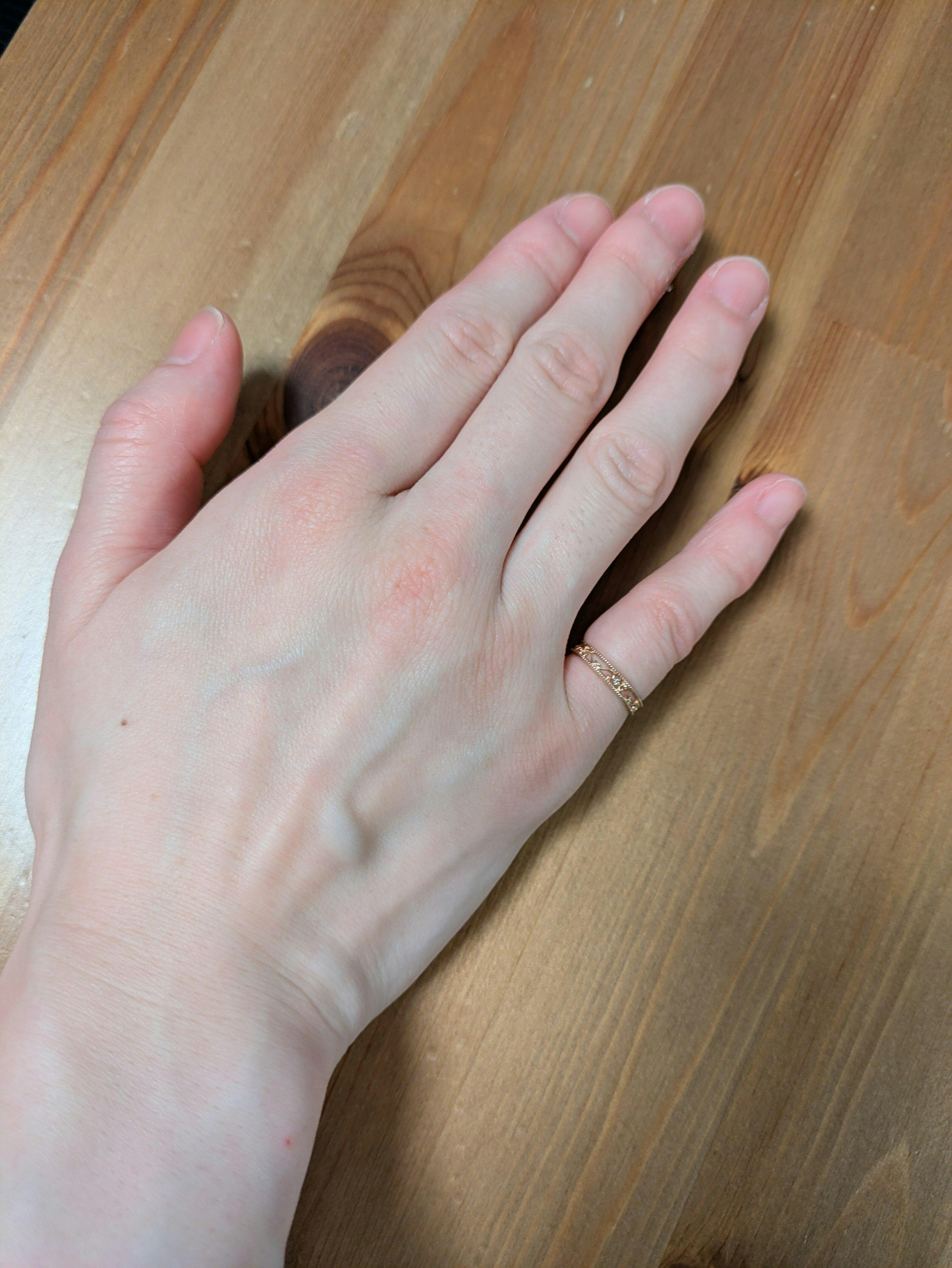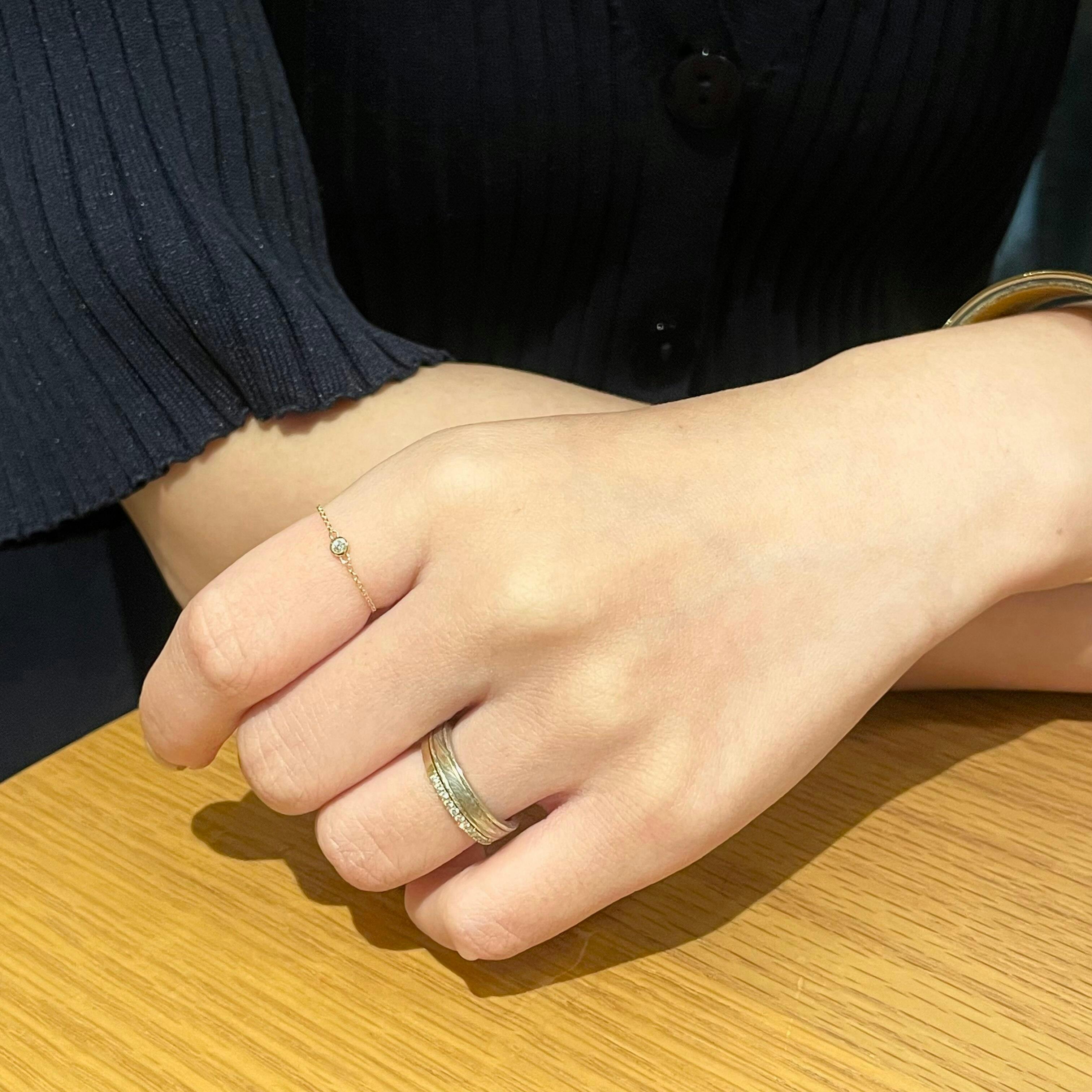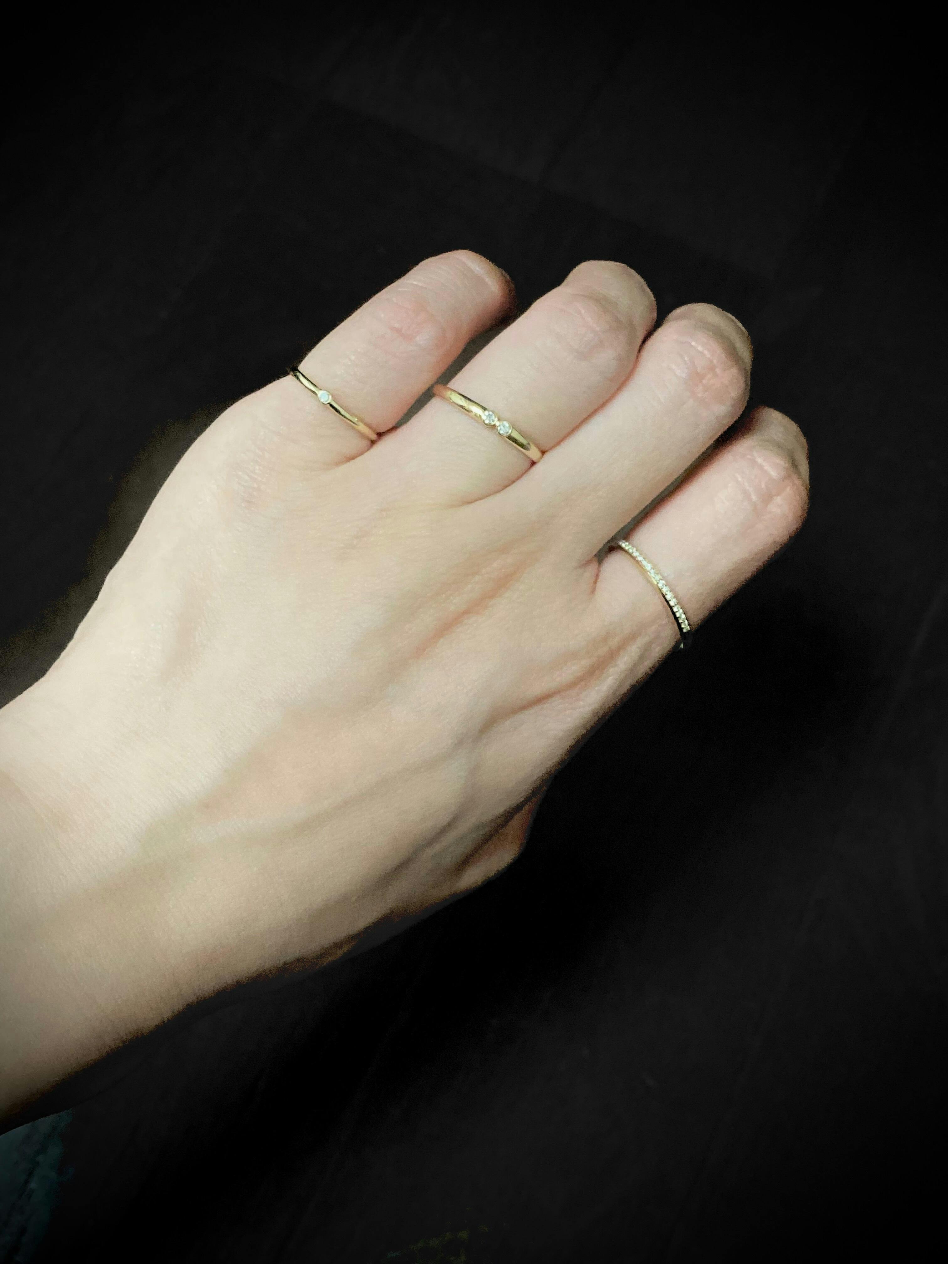 結婚指輪はつけっぱなし派で、色味が気に入っているのですが肌馴染みが良すぎて物足りなく感じていました。重ね付け用の指輪を色々探して、こちらに辿り着きました。