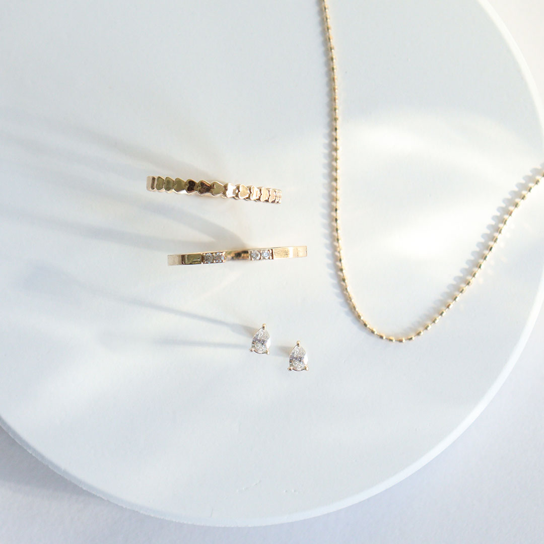 At MONATELIER, we are particular about the base metal of our jewelry, and use a special K10 that is harder than regular K10 while maintaining the same gold content. Regular K10 is a mixture of 41.7% pure gold and around 58% silver and copper.