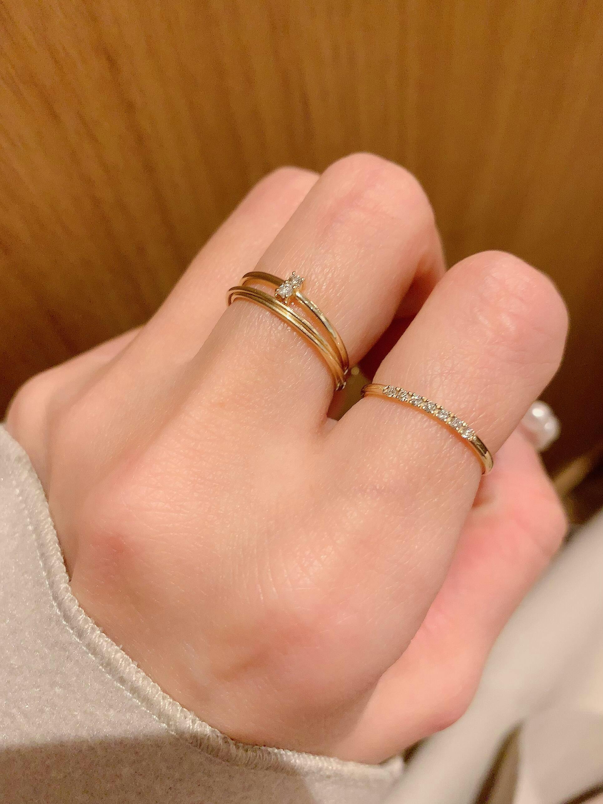 2つのダイヤが縦にセッティングされた、ゴールド×ダイヤモンドのリング。 独創的なデザインでありながら身につけやすく、指なじみの良さも魅力です。