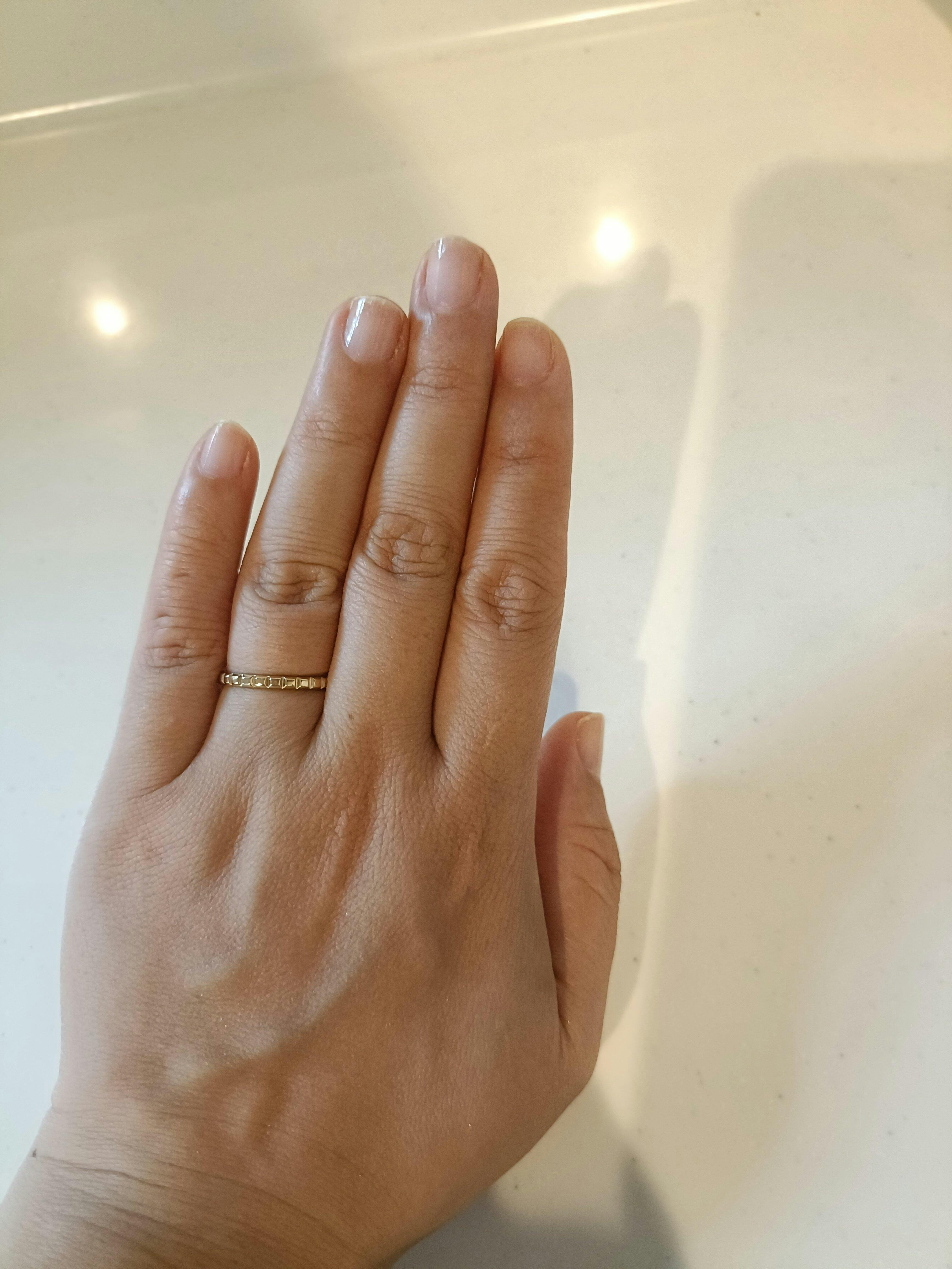 結婚指輪はつけっぱなし派で、色味が気に入っているのですが肌馴染みが良すぎて物足りなく感じていました。重ね付け用の指輪を色々探して、こちらに辿り着きました。