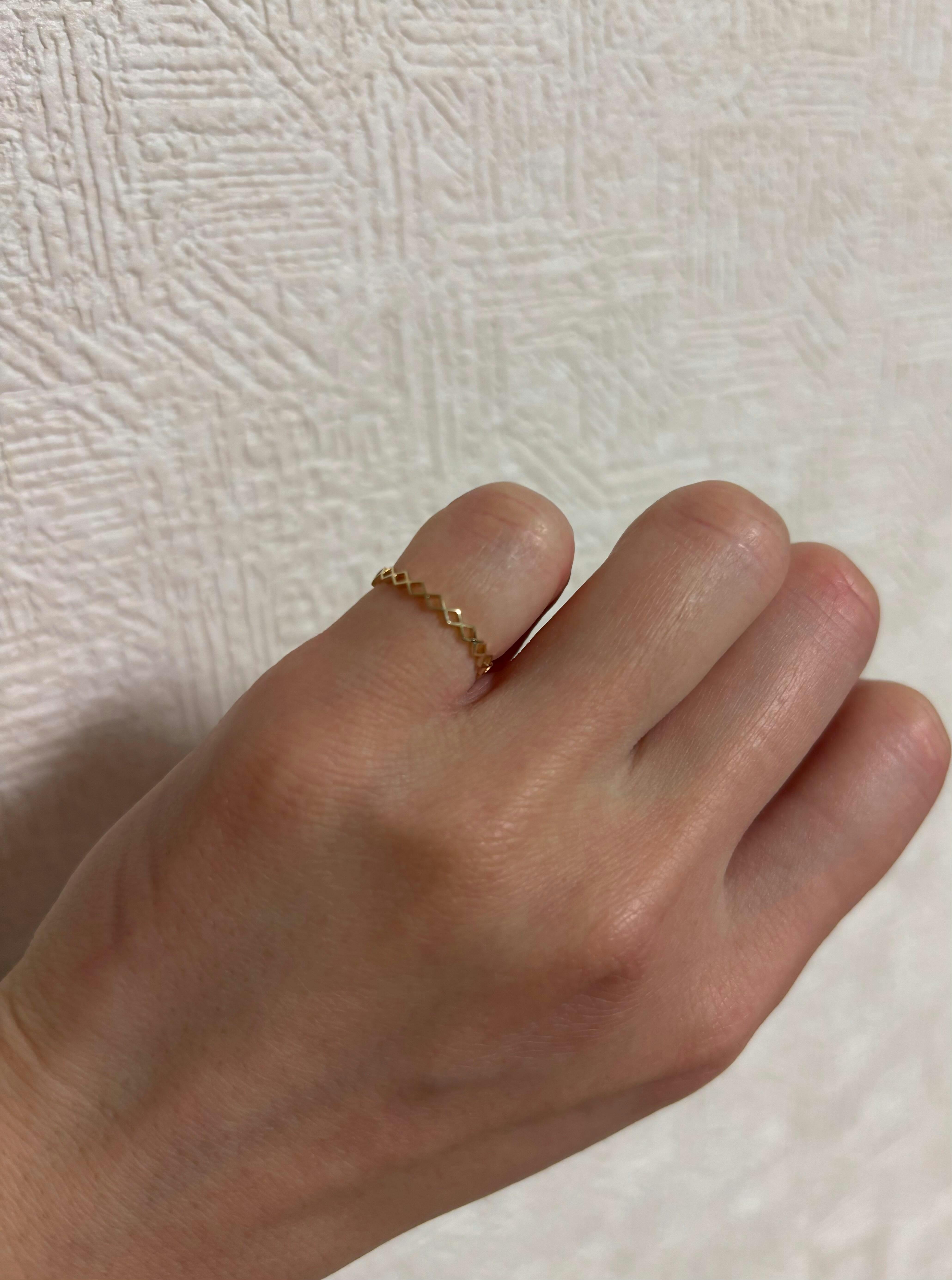 モナトリエのリングとネックレスはどれもお値段以上の煌めきで毎日何かしら身につけています。値上げ前に初めてのピンキーリングとして購入しました。ダイヤの大きさはヘルマンよりも一粒は大きい印象です。ピンキーリングはシンプルなデザインが多い中デザイン性が高く、ダイヤのある側を内外にする付け方を日によって変えられるのも良いです!リングゲージでは0号でしたが、1号でも動くことなく夏場に浮腫んでも着けられそうです。