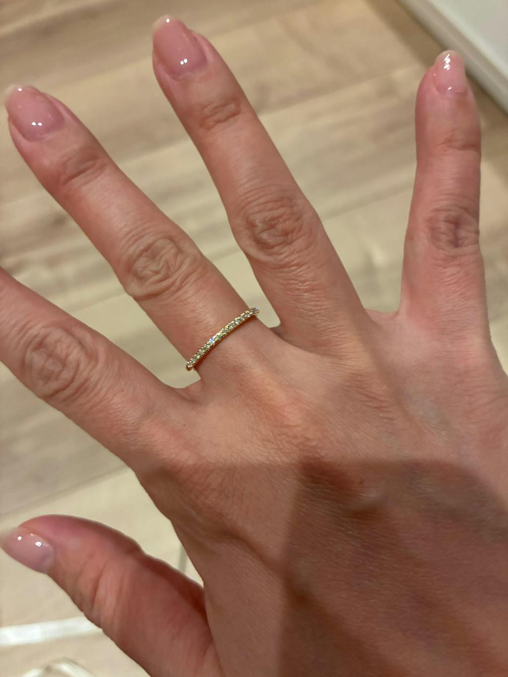 指通りの良いフォルムに仕上げ、サイドの膨りをなくしシンプルながらダイヤモンドの輝きをしっかり楽しめる一本。通常のステラエタニティリングと比べると肌になじむ優しい煌めきがポイント。